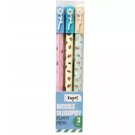 Wesołe długopisy marki Kayet - 3 sztuki w opakowaniu. Pięknie się prezentują. Kolory wkładów do długopisów to czarny (1 sztuka) oraz niebieski (2 sztuki). Posiadają unikalną formułę żelowego tuszu. Każdy długopis posiada zatyczkę z motywem kwiatka.