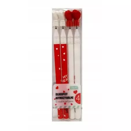 Dzięki gumce możliwa jest szybka korekta - tekst można zmazać. Posiadają unikalną formułę żelowego tuszu. Każdy długopis ma na nasadce motyw walentynkowy.