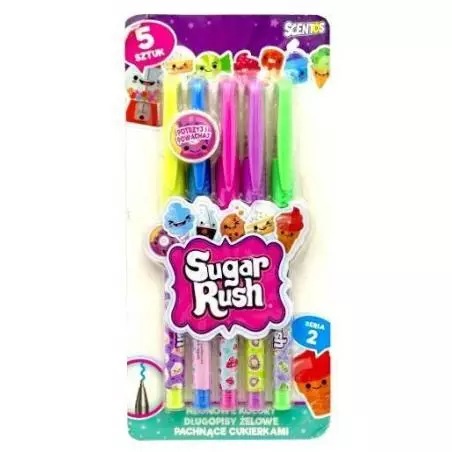Neonowe kolory, długopisy żelowe pachnące cukierkami! Każdy z pięciu długopisów pachnie inaczej! Zestaw zawiera długopisy o zapachu arbuz, jagoda, banan, jabłko, winogrono.