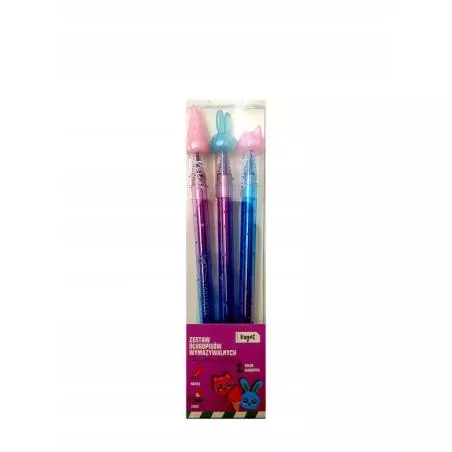 3 sztuki w opakowaniu. Pięknie się prezentują. Kolory wkładów do długopisów to czarny (1 sztuka) oraz niebieski (2 sztuki). Dzięki gumce możliwa jest szybka korekta - tekst można zmazać gumką do ścierania. Posiadają unikalną formułę żelowego tuszu. Każdy długopis posiada na nasadce kotka, króliczka oraz lód.