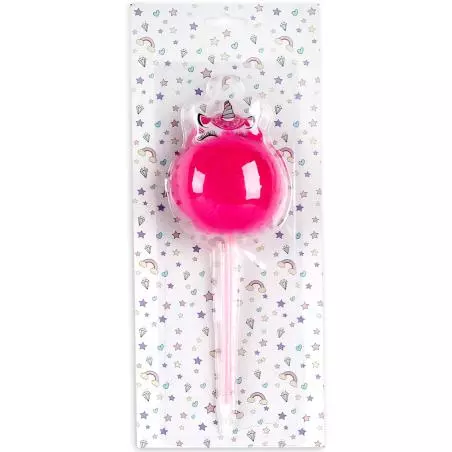- ozdobiony różowym puszkiem oraz dmuchaną głową jednorożca