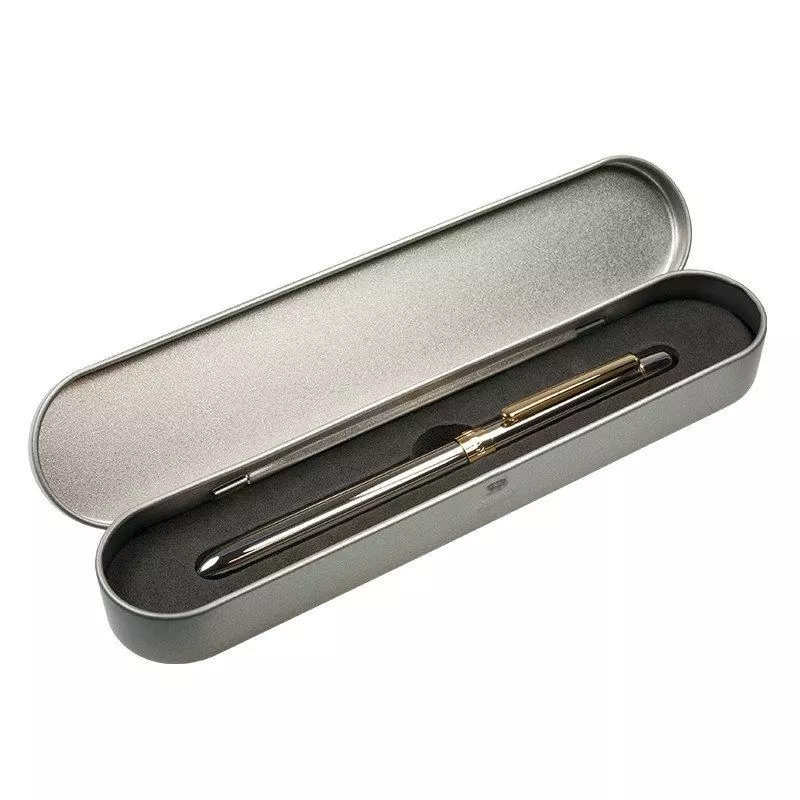 Chromowana srebrna obudowa, w centralnej części okrągły detal z wytłoczonym logo MILAN i złotym klipsem. Zbiornik z atramentem jest opatrzony datą produkcji. Wyprodukowany w Japonii. Metalowe pudełko, idealne na prezent.