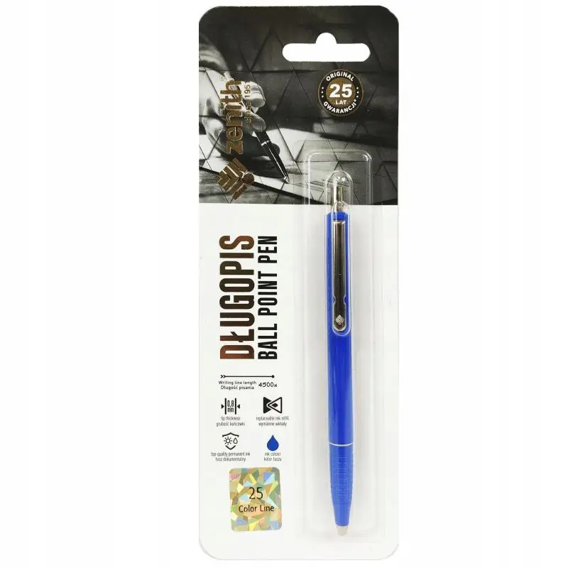 Długopis automatyczny Zenith Color Line 25 niebieski to solidny i funkcjonalny produkt przeznaczony do codziennego pisania w szkole, biurze i domu. Klasyczna konstrukcja Zenith połączona z nowoczesną linią kolorystyczną zapewnia komfort użytkowania, trwałość oraz estetyczny wygląd.
