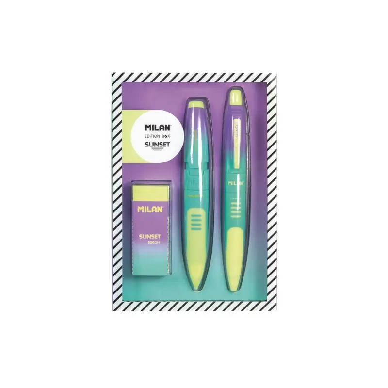 Zestaw upominkowy Milan mały Sunset zielono-żółty łączy funkcjonalność i atrakcyjny design. Dzięki kompaktowym rozmiarom można go łatwo przenosić, a wysoka jakość przyborów zapewnia komfort i trwałość podczas codziennego użytkowania. To doskonały pomysł na prezent dla dzieci, który wspiera rozwój kreatywności i organizację pracy szkolnej.
