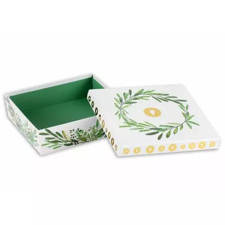 - ozdobione motywem w zielone gałązki oraz złote serca