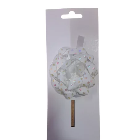Biała rozetka z nadrukowanymi małymi serduszkami to uroczy detal dekoracyjny, który wnosi subtelność i romantyczny akcent.