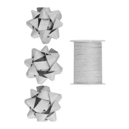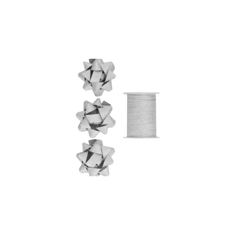 Zestaw akcesoriow do pakowania prezentów. Brokatowo srebrna kolorystyka pomoże nadać prezentom wyjątkowej oprawy bardzo elegancki i gustowny zapakowany w pudełko pvc na zestaw składa się: wstążki 1cmx10m oraz 3 rozetk