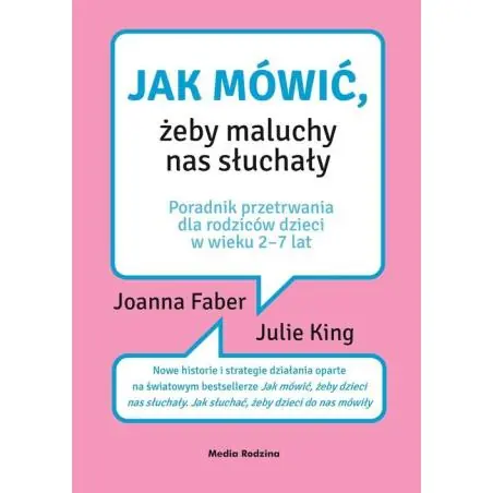 Podręcznik niezbędny dla każdego, kto w domu czy w pracy ma do czynienia z małymi dziećmi, poprzedzony przedmową Adele Faber, jedną z autorek bestsellerowego Jak mówić, żeby dzieci nas słuchały. Jak słuchać, żeby dzieci do nas mówiły, nazwanego przez „The Boston Globe” „biblią wychowania”. Jak poradzić sobie z maluchem, który nie chce myć zębów, odmawia jedzenia warzyw lub rozrzuca książki po całym pokoju? Jak mówić, żeby maluchy nas słuchały to kompendium wiedzy dotyczącej wychowania dzieci w wieku 2-7 lat. Autorki, Joanna Faber (córka Adele) i Julie King dzielą się swoim wieloletnim doświadczeniem w pracy z dziećmi, a także wyciągają wnioski z wielu rozmów z rodzicami i specjalistami i za pomocą autentycznych historii oraz komiksów znanych z poprzednich tytułów w serii dostarczają szeregu praktycznych narzędzi i wskazówek, jak się komunikować, rozmawiać i rozwiązywać trudne sytuacje, nie ignorując przy tym potrzeb dziecka ani swoich.