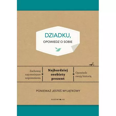 Darowując książkę „Dziadku, opowiedz o sobie”, dajesz swojemu dziadkowi więcej niż pięknie wydaną, ładnie oprawioną, nienapisaną jeszcze historię. Dajesz mu poczucie, że jest dla Ciebie ważny. Dzięki odpowiedziom na proste i wnikliwe, zawarte w dzienniku pytania dajesz dziadkowi możliwość spisania losów i wspomnień, przelania uczuć