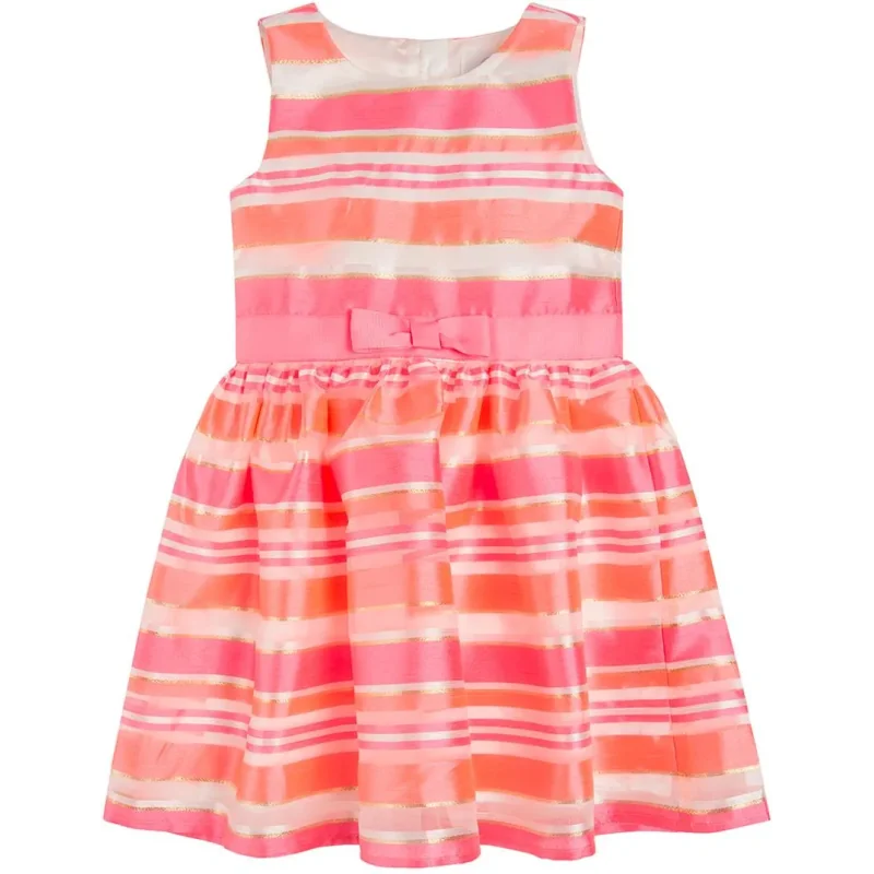 Sukienka bez rękawów, w paski ze złotym wykończeniem to doskonały wybór na eleganckie okazje, których nie brakuje w okresie wiosenno-letnim. Komunia, wesele czy szkolny bal, sukienka z szerokim dołem i ozdobną taśmą w pasie zapewni dziewczynce wyjątkowy look oraz wygodę. 100% poliester poszewka 100% poliester bez rękawów z tyłu zapięcie na