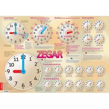 Do planszy dołączono ruchome wskazówki do samodzielnego zamontowania.I strona: tarcza zegarowa z zaznaczonymi i opisanymi godzinami, informacje graficzne o liczeniu minut na zegarze – 1 godzina to 60 minut; ciekawostka o sekundach/; godziny przed i południu – oznaczenia i nazwy.