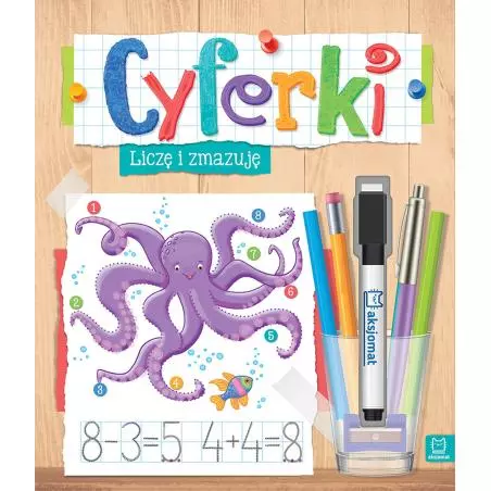 Dzieci znajdą tu duże wzory liczb oraz proste działania. „Cyferki. Piszę i zmazuję” - udane połączenie nauki i zabawy. Pisak i zmywalny papier umożliwiają wielokrotną zabawę w pisanie i zmazywanie. Dzieci piszą szlaczki i rozwijają sprawność manualną oraz zapamiętują kształty cyfr. Zabawowa forma zachęca do wielokrotnych powtórzeń