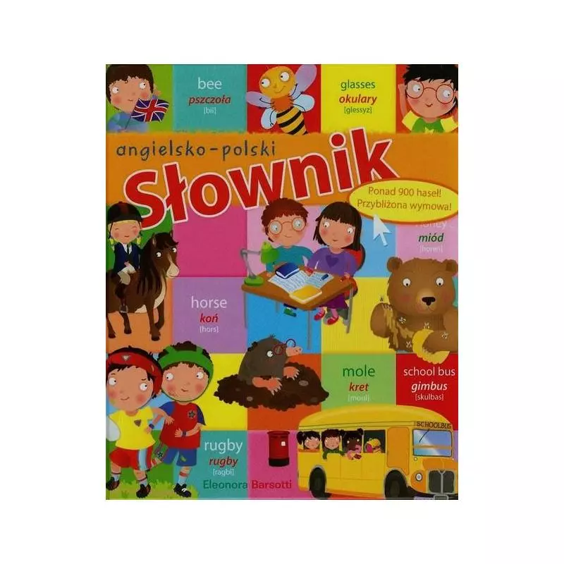 Ponad 900 haseł! Przybliżona wymowa! Ilustrowany tematyczny słowniczek angielsko-polski ułatwi dzieciom poznawanie podstawowych angielskich słów. Dzięki zabawnym obrazkom dziecko łatwiej zapamięta słówka i ich pisownię.