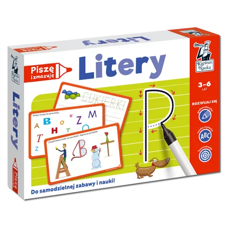 „Piszę i zmazuję. Litery” (3–6 lat) to bogato ilustrowany zestaw zabaw (książka + karty ścieralne + flamaster) do nauki liter. Dzięki kolorowym łamigłówkom i zadaniom graficznym przedszkolaki uczą się poprawnego kierunku pisania liter oraz doskonalą umiejętność zapisu prostych wyrazów. Rozwijają przy tym również zdolność koncentracji i percepcji wzrokowej.