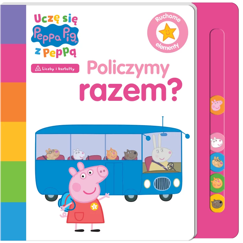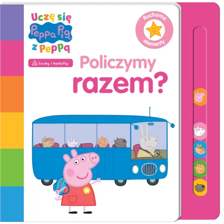 Edukacyjna linia książek, tworząca kompleksowy program edukacyjny dla przedszkolaków, w której ciekawska świnka Peppa zachęca maluchy do wspólnego odkrywania świata i zdobywania nowych umiejętności. Wsiądź do autobusu z Peppą oraz jej przyjaciółmi i ćwicz liczenie do 5. Przesuń znacznik z postacią za każdym razem, gdy kolejny pasażer wsiada do autobusu, i licz, ilu przyjaciół znajduje się już wewnątrz. To nie wszystko!