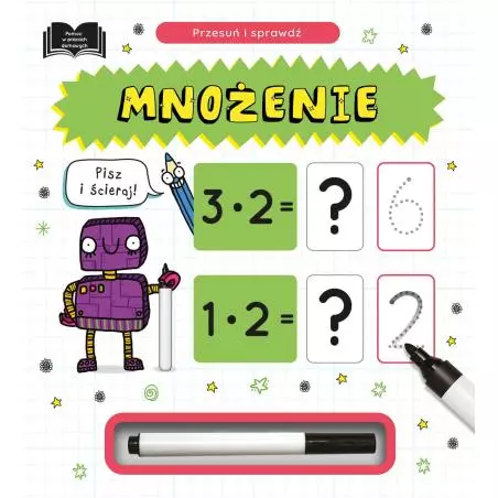 Seria „Przesuń i sprawdź” stanowi świetne wsparcie w nauce dodawania i mnożenia. Dzięki ścieralnemu pisakowi dołączonemu do książek, odpowiedzi w każdym momencie można zetrzeć, a okienka ponownie uzupełnić. Dzięki temu dziecko, które dopiero poznaje działania matematyczne nie zniechęci się do nauki.