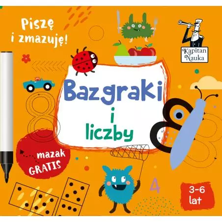 Książka „Bazgraki i liczby” przeznaczona jest do wielokrotnego użytku, ponieważ zamiast zwykłego papieru ma zmywalne karty. Dołączony do niej flamaster suchościeralny pozwala zmazywać odpowiedzi oraz rozwiązywać i poprawiać zadania bez końca.