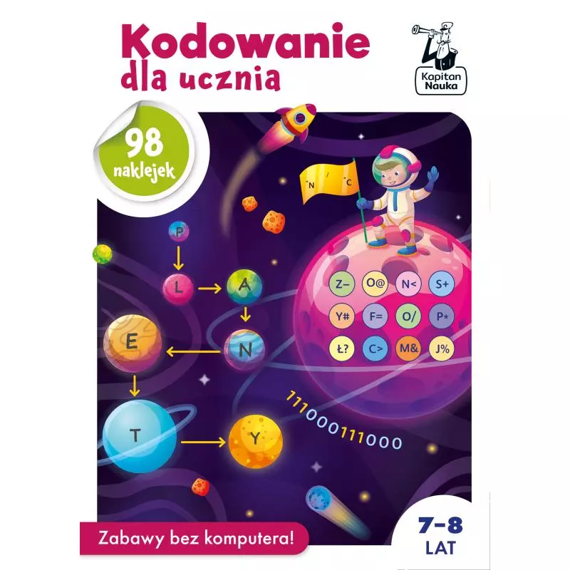 Kodowanie dla ucznia (7–8 lat) to bogato ilustrowana książka wprowadzająca uczniów młodszych klas podstawowych w świat kodowania bez użycia komputera. Zawiera zabawy z sekwencjami i algorytmami oraz ćwiczenia na wyznaczanie tras i tworzenie kodu. Zadania z kodami oparte są na literach, liczbach i symbolach, aby rozwijać myślenie abstrakcyjne,