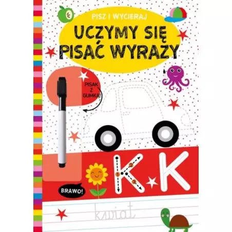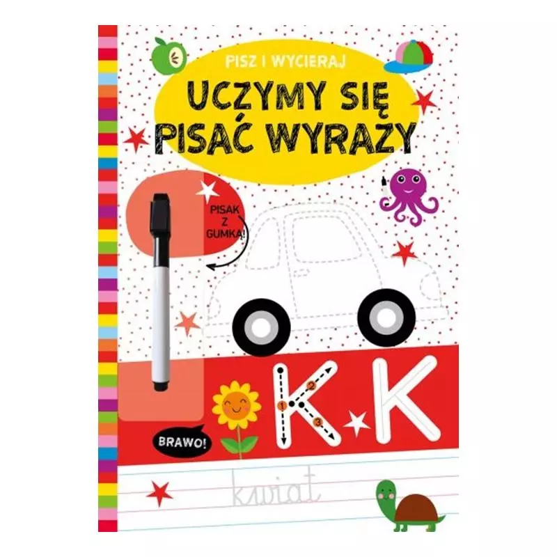 Strzałki wskażą mu kierunek zapisu dużych liter drukowanych na czerwonych polach, później poćwiczy pisanie wyrazów po śladzie. Zadanie ułatwią mu specjalna gumka dołączona do pisaka i odpowiednio przygotowane strony, które umożliwią wielokrotne poprawianie.