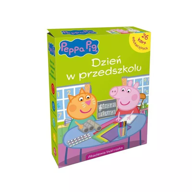Nauka przez zabawę to świetny sposób na zdobywanie wiedzy! W pudełku znajduje się 26 kart obrazkowych, które pomogą maluchowi uporządkować codzienne czynności, a także oswoją go z wizytami w przedszkolu. Dziecko będzie rozwiązywało wesołe zadania i ćwiczyło spostrzegawczość, a wszystko w towarzystwie swoich ulubionych bohaterów. Akademia bystrzaka to seria kart edukacyjnych, która: -rozwija myślenie logiczne i spostrzegawczość -pobudza wyobraźnię -ćwiczy koncentrację -poprawia pamięć wzrokową Odszukaj kod QR na jednej z kart, zeskanuj go i zdobądź dyplom świnki Peppy.