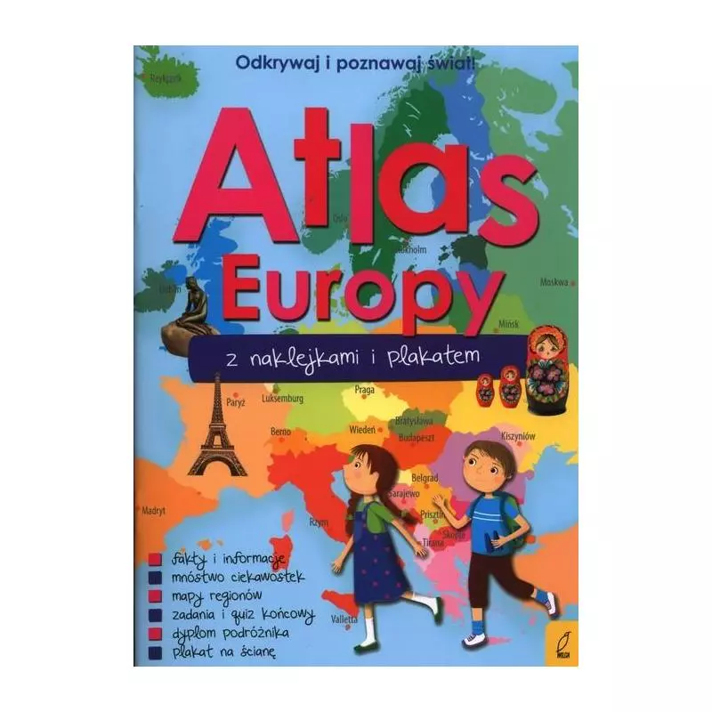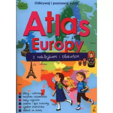 Nowe atlasy z naklejkami i plakatem, które w naturalny sposób łączą naukę z zabawą. Atlas geograficzny Polski zawiera informacje o parkach narodowych i krajobrazowych, zwierzętach i roślinach Polski, podziale administracyjnym, rekordach geograficznych oraz pokazuje Polskę na tle mapy świata. Miłym dodatkiem do atlasu jest plakat. Atlas Europy zawiera mapę Europy, podział polityczny, krainy geograficzne, informacje na temat ludności poszczególnych państw oraz Unii Europejskiej. W środku dzieci znajdą kolorowe naklejki, które należy umieścić w konkretnych miejscach.