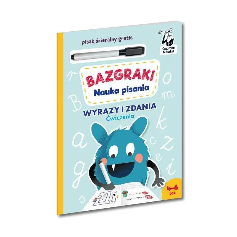 Bazgraki. Nauka pisania. Wyrazy i zdania. Ćwiczenia (5–7 lat) to zestaw pomysłowych zabaw wspierających przedszkolaka w nauce łączenia liter w sylaby, wyrazy i zdania. Forma książki ze ścieralnym pisakiem pozwala dziecku na trenowanie umiejętności grafomotorycznych z radością i bez stresu. W książce znajduje się mnóstwo atrakcyjnych łamigłówek, które ćwiczą rękę w pisaniu wszystkich liter polskiego alfabetu i prawidłowym ich łączeniu z innymi. Zamieszczone na dole strony ćwiczenia z liniaturą przygotowują do płynnego pisania w liniach oraz rozwijają językową kreatywność – dziecko zapisuje wyrazy, które pojawiły się na stronie lub samodzielnie wymyślone słowa czy zdania. Kolorowe ilustracje z sympatycznymi Bazgrakami uprzyjemniają naukę pisania i odnoszą poruszane zagadnienia do świata bezpośrednio znanego dziecku, dzięki czemu ułatwiają czytanie wyrazów ze zrozumieniem. Dołączony do książki pisak ścieralny pozwala na zabawę bez końca, w przyjemnej atmosferze, metodą prób i poprawek, a wygodny, duży format A4 umożliwia swobodne ćwiczenie umiejętności pisania. Książka zawiera również wskazówki metodyczne dla rodziców. Autorką zabaw jest Antonina Szulczyk, nauczycielka czytania i pisania, trenerka oraz terapeutka ręki, która na co dzień pracuje z dziećmi w wieku przedszkolnym i szkolnym. W serii „Bazgraki”: Bazgraki. Nauka pisania. Elementarz (3–7 lat) Bazgraki. Nauka pisania. Szlaczki i litery. Ćwiczenia (3–5 lat) Bazgraki czytają sylabami. Czytanie sylabowe. Elementarz (4–6 lat) Bazgraki czytają sylabami. Czytanie sylabowe. Ćwiczenia (4–6 lat) Bazgraki czytają wyrazy i zdania. Czytanie sylabowe. Elementarz (5–7 lat) Bazgraki czytają wyrazy i zdania. Czytanie sylabowe. Ćwiczenia (5–7 lat) Bazgraki i gimnastyka języka. Ćwiczenia logopedyczne (2–5 lat) Bazgraki mówią trudne słowa. Ćwiczenia logopedyczne (4–7 lat) Bazgraki poznają angielski. Pierwsze słowa Bazgraki poznają kolory i kształty (2–3 lata) Bazgraki poznają przeciwieństwa (2–3 lata) Bazgraki poznają litery (4–6 lat) Bazgraki poznają liczby (4–6 lat) Bazgraki i zabawy 3-latków Bazgraki i zabawy 4-latków Bazgraki i zabawy 5-latków Bazgraki i zabawy 6-latków Bazgraki czekają na święta (3–6 lat) Bazgraki. Kosmiczna wyprawa. Zabawy edukacyjne (4–5 lat) Bazgraki. Super pojazdy. Zabawy edukacyjne (5–6 lat)