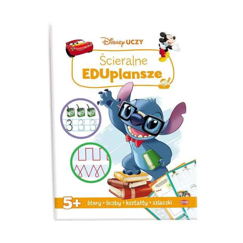 Doskonała pomoc dla pilnego przedszkolaka! W teczce można znaleźć aż 4 dwustronne ścieralne plansze. Dzięki nim nauka stanie się przyjemnością, a pisanie szlaczków, cyferek i literek nie będzie więcej problemem. Ścieralne strony umożliwią wielokrotne powracanie do zabawy z planszami. Stitch, Zygzak McQueen, Buzz Astral i wiele innych ulubionych bohaterów ze świata Disneya urozmaici naukę i sprawi, że stanie się ona świetną rozrywką.
