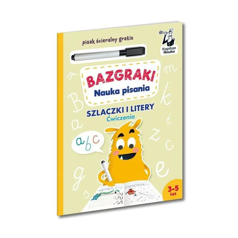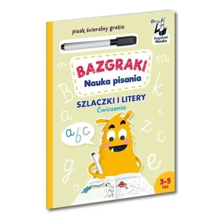Bazgraki. Nauka pisania. Szlaczki i litery. Ćwiczenia (3–6 lat) to książka z pisakiem suchościeralnym przeznaczona dla przedszkolaków do nauki liter i trenowania umiejętności grafomotorycznych. W książce znajduje się mnóstwo atrakcyjnych łamigłówek, które ćwiczą rękę w rysowaniu prostych szlaczków i ułatwiają zapamiętanie oraz