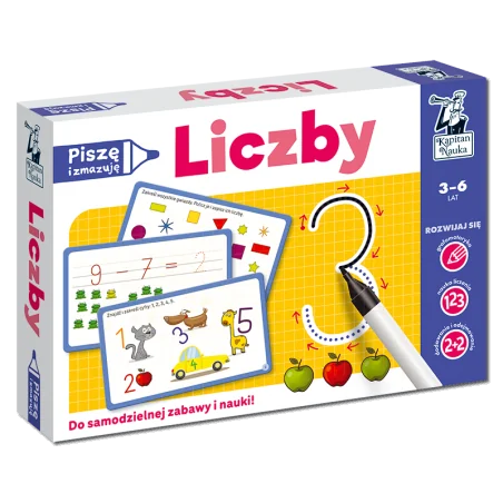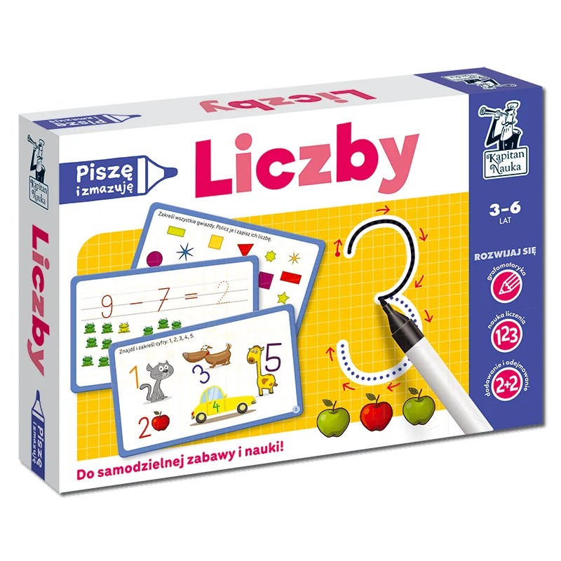 Piszę i zmazuję. Liczby (3–6 lat) to bogato ilustrowany zestaw zabaw (książka + karty ścieralne + flamaster) do nauki cyfr i liczb, który rozwija umiejętność liczenia oraz wspiera rozwój grafomotoryczny. Dzięki kolorowym łamigłówkom i zadaniom graficznym przedszkolaki uczą się poprawnego kierunku pisania liczb oraz doskonalą umiejętność przeliczania przedmiotów i rozwiązywania prostych działań arytmetycznych. Rozwijają przy tym również zdolność do koncentracji i myślenia logicznego.