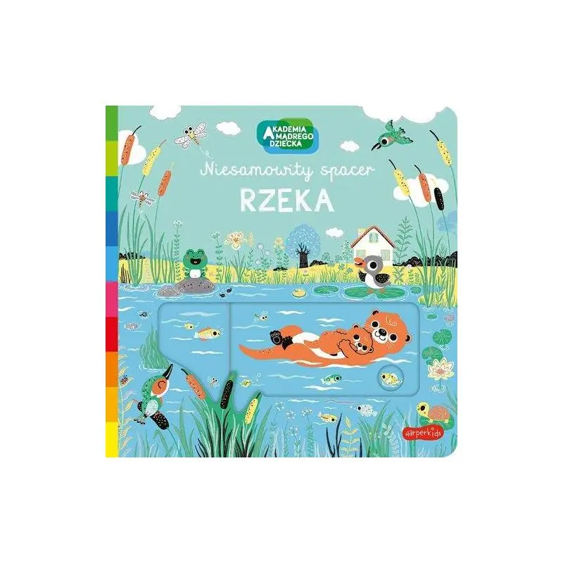 Kolejną nowością w serii Niesamowity spacer jest tytuł Rzeka. Jest to książeczka z ruchomymi elementami oraz srebrnymi tłoczeniami przeznaczona dla najmłodszych. Wyróżnia się kontrastowymi kolorami, prostą formą przedstawiania i zapamiętywana poszczególnych słówek, poprzez skojarzenie ich z otaczającą dzieci rzeczywistością. Grube, solidne strony zapewnią wytrzymałość oraz długie użytkowanie, wspomagając rozwój manualny małych rączek. Książeczka Rzeka z Akademii Mądrego Dziecka pokazuje młodemu czytelnikowi jakie zwierzęta, ptaki oraz roślinność można spotkać przy rzece czy stawie. Rodzic z dzieckiem może policzyć ile kaczek krzyżówek pływa po rzece, a ile żabek siedzi na liściach lilii. Wspólnie poznają jakie ryby i skorupiaki żyją w rzece oraz co kryje się w trzcinach przy brzegu. Serię książeczek „Akademia mądrego dziecka. Niesamowity spacer” wyróżniają ruchome elementy, odkrywające przed maluchami odpowiedzi na umieszczone w książce pytania oraz zmieniające wygląd poszczególnych ilustracji. Połączenie zabawy z nauką zachęca dzieci do samodzielnego sięgania po lekturę. Książeczka edukacyjna świetnie sprawdzi się podczas poznawania prostych słów, nazw przedmiotów i ich przeznaczenia.