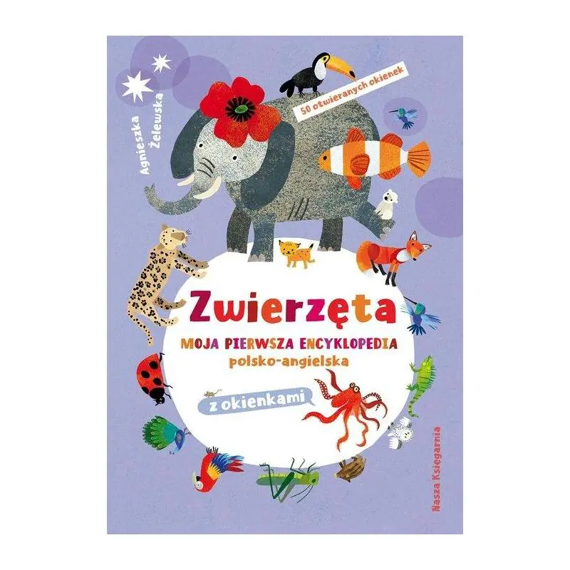 „Moja pierwsza encyklopedia polsko-angielska z okienkami” to seria edukacyjna, dzięki której najmłodsi poznają świat i uczą się angielskich słówek. W tej części pojawia się słownictwo związane ze światem zwierząt – w sumie ponad 200 słówek! Czytelnicy odwiedzą dom pewnego podróżnika, las, dżunglę, sawannę, zanurkują w morzu, a nawet dotrą do krainy całej pokrytej śniegiem. Na każdej rozkładówce można odszukać i otworzyć okienka (w całej książce jest ich 50), co pozwala odkrywać kolejne szczegóły i słowa. Książka idealna dla miłośników zwierząt! Agnieszka Żelewska – ukończyła studia i uzyskała dyplom w PWSSP w Gdańsku na Wydziale Malarstwa i Grafiki. Zajmuje się ilustracją dla dzieci. Brała udział w Międzynarodowych Biennale Ilustracji dla Dzieci w Bratysławie i Japonii, w ekspozycjach PRO BOLONIA w Warszawie, wystawie FILU pt. „Polscy Ilustratorzy” we Frankfurcie, w Biennale Europejskich Ilustratorów w Japonii, wystawie polskiej ilustracji w Bolonii 2003, Triennale Ilustracji Krajów Nadbałtyckich w Tallinie 2003 i in. Nagrody: główna nagroda Polskiej Sekcji IBBY Książka Roku 2000 za ilustracje do książki „Marcel Szpak dziwi się światu” Joanny Pollakówny; wyróżnienie PRO BOLONIA 2001 za ilustracje do książki „Sznurkowa historia” Roksany Jędrzejewskiej-Wróbel; główna nagroda Polskiej Sekcji IBBY Książka Roku 2002 za ilustracje do książki „Bajki o rzeczach i nie rzeczach” Zofii Beszczyńskiej; wyróżnienie Polskiej Sekcji IBBY Książka Roku 2003 w dziedzinie grafiki za autorską książkę pt. „Gdzieżeś ty bywał, czarny baranie?”, wyróżnienie w konkursie PTWK Najpiękniejsze Polskie Książki 2021 za „W domu. Moja pierwsza encyklopedia polsko-angielska z okienkami”. Powyższy opis pochodzi od wydawcy.