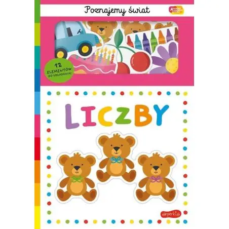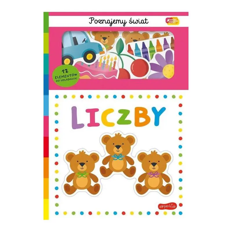 Zapraszamy do zapoznania się z nowością w serii Poznajemy Świat, Akademii Mądrego Dziecka pod tytułem Liczby. Każda strona książeczki zaprasza do zabawy i nauki cyferek. Przejedź paluszkiem po pustych miejscach na stronie i zobacz, jak wygląda dana liczba. Znajdź odpowiedni puzzel, dopasuj i włóż w puste miejsce. Następnie pokaż na paluszkach cyferkę. A może masz w swoich zabawkach autko, pluszowe misie czy kredki. Policz z rodzicem swoje zabawki! Poznajemy świat to seria książeczek znana i lubiana przez dzieci i rodziców. Ten zestaw to idealny prezent, w którym znajduje się kartonowa książeczka oraz 12 puzzli, które trzeba umiejscowić na odpowiedniej stronie. Zapraszamy do wspólnej zabawy i poznawania pierwszych słów. Seria książeczek Poznajemy świat z Akademii Mądrego Dziecka pokazuje i uczy świata, dodatkowo ćwicząc małą motorykę i pomagając w skupieniu.