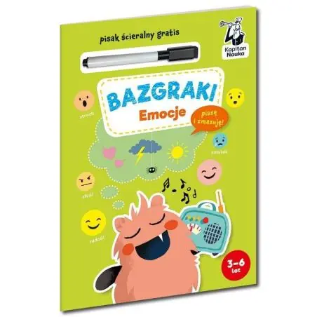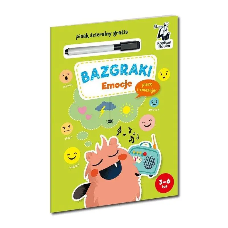 Bazgraki poznają emocje i rozwiązują łamigłówki! W tym zeszycie znajdziesz różnorodne i angażujące zadania, które gwarantują długą zabawę! Łamigłówki wciągną cię w świat Bazgraków i ich szalonych pomysłów. Poznaj emocje, które towarzyszą nam każdego dnia! Co czują Bazgraki na spacerze? Która mina wyraża strach, a która radość? Co cieszy Rządka? Czego Gryzka się boi? Do zeszytu dołączony jest pisak ścieralny, dzięki któremu można rozwiązywać zadania bez końca! Kapitan Nauka to marka, która powstała dzięki rodzicom poszukującym mądrej, pełnej radości, ale i wymagającej rozrywki dla dzieci. Skupiamy się na zagadkach, grach, puzzlach i książeczkach, które uczą przez kreatywną zabawę i wspomagają rozwój dziecka. Produkty Kapitana Nauki dostosowane są do potrzeb dzieci od narodzin do 11. roku życia. Stymulują rozwój kluczowych umiejętności, takich jak koncentracja, pamięć, spostrzegawczość, myślenie logiczne, kreatywność. Są świetną alternatywą dla smartfona czy komputera, a czas spędzony przy wspólnych rozgrywkach, w gronie rodziny lub rówieśników wzmacnia więzi i umiejętności komunikacyjne.