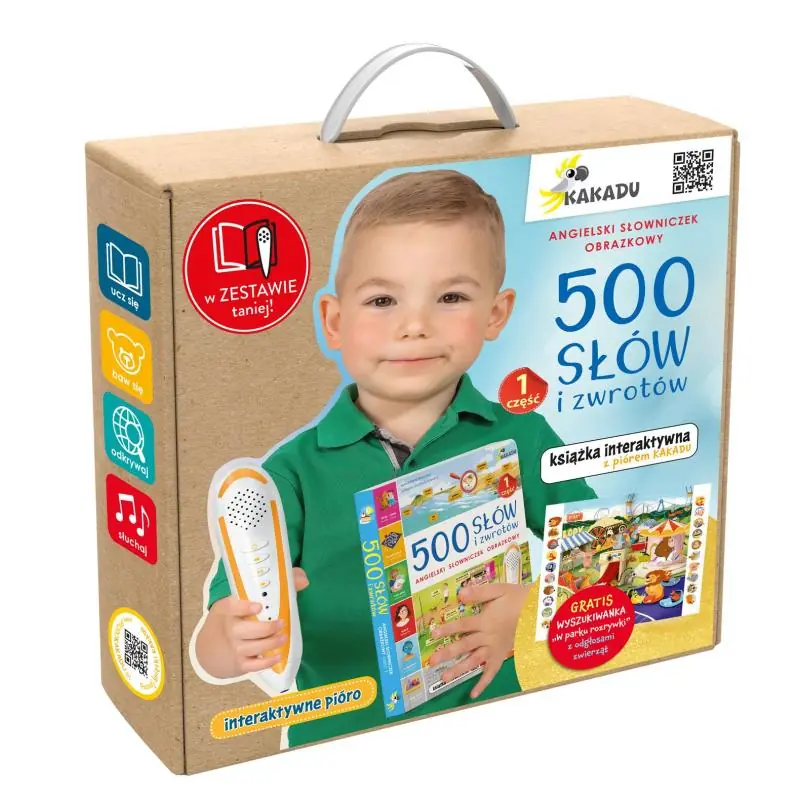 Zestaw zawiera: książkę 500 słów i zwrotów. Angielski słowniczek obrazkowy cz. 1, pióro Kakadu w trwałym etui i planszę z wyszukiwanką W parku rozrywki, dzięki której dzieci sprawdzą swoją spostrzegawczość, poznają nazwy zwierząt i usłyszą odgłosy, jakie one wydają. Całość została zamknięta w pudełku z rączką.