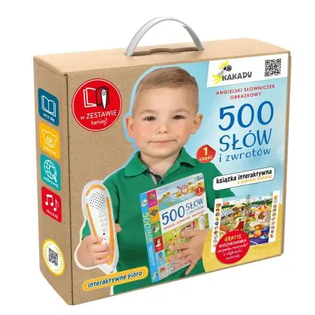 500 słów i zwrotów. Angielski słowniczek obrazkowy cz. 1 to interaktywna książka z piórem Kakadu, które uruchamia zakodowane na stronach teksty i dźwięki. Publikacja jest częścią innowacyjnego systemu nauki i zabawy w jednym.