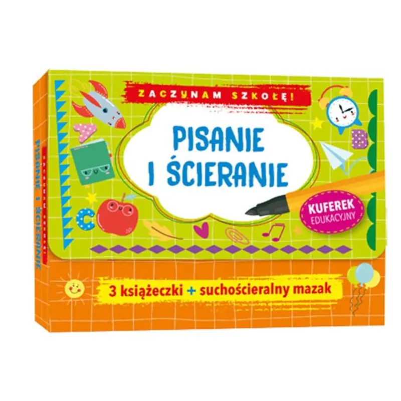Wspaniały wstęp do nauki pisania! Ten kolorowy kuferek z suchościeralnym mazakiem będzie doskonałą pomocą edukacyjną dla dzieci rozpoczynających szkołę. W trzech umieszczonych w nim książkach można samodzielnie wykonywać ciekawe zadania, ćwiczyć szlaczki, pisać literki i proste wyrazy. Dołączony pisak sprawia, że błędy łatwo poprawić.