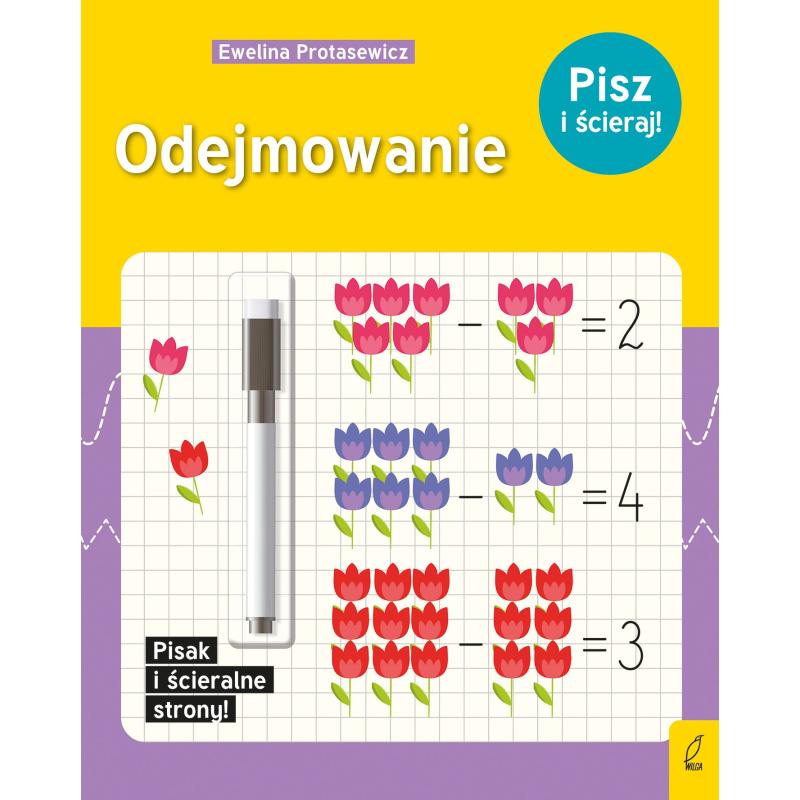 Seria „Pisz i ścieraj!” doskonale łączy naukę z zabawą i jest świetnym wprowadzeniem do świata liter i cyfr. W każdym zeszycie oprócz liniatur, kratek czy szlaczków znajdują się proste zadania, polegające na rysowaniu po śladzie. Do książki dołączono pisak, który można zetrzeć za pomocą umieszczonej w skuwce gąbeczki. Dzięki temu zadania można wykonywać wielokrotnie, co sprzyja utrwaleniu zdobytej wiedzy.