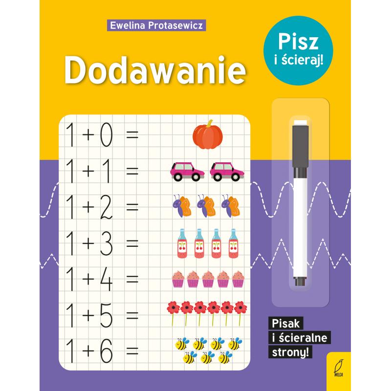 "Pisz i ścieraj!" To seria książek ze zmywalnymi stronami i pisakiem. Seria, która pomaga w nauce alfabetu, liczb, pisania i liczenia. Dzięki zmywalnemu pisakowi dziecko może ćwiczyć pisanie liter i cyfr wiele razy. Naukę ułatwia pisanie po śladzie a dziecko doskonali także zdolności manualne oraz spostrzegawczość i pamięć wzrokową.