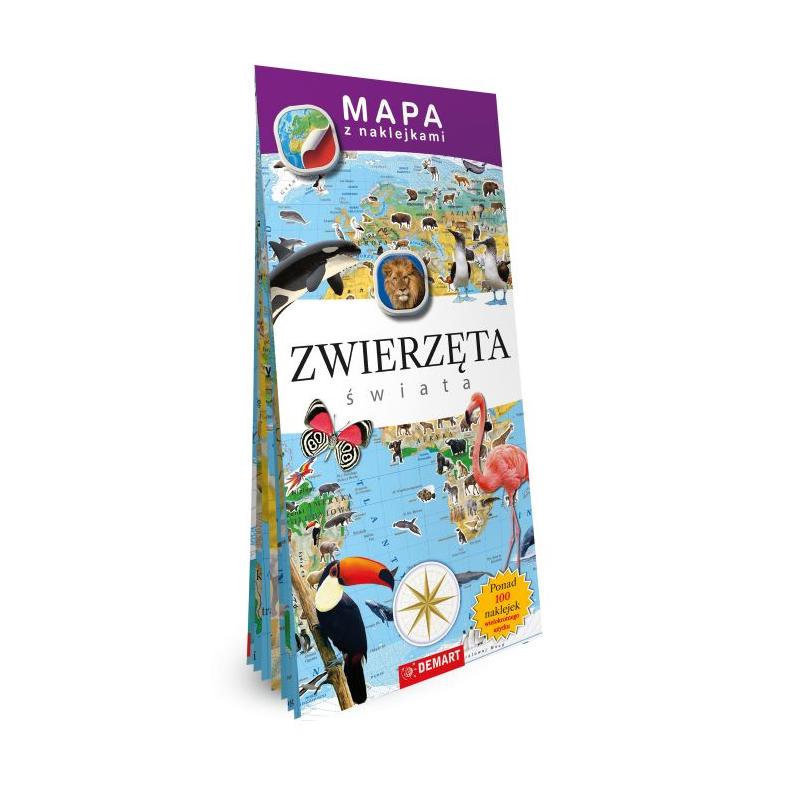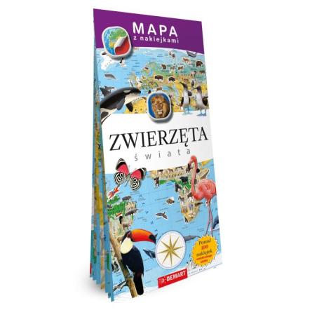 Składana mapa świata w formacie B1 z dołączonymi naklejkami wielokrotnego użytku, do samodzielnego uzupełnienia treści mapy. Na mapie opisano kontynenty, wyspy oraz najważniejsze morza i oceany, zaznaczono też umowne granice między oceanami i kontynentami. Dziecko przez zabawę poznaje geografię świata, jego roślinne i zwierzęce zróżnicowanie. Wybrano zwierzęta dobrze znane, powszechnie występujące, ale także przedstawiono zwierzęta rzadkie, którym grozi wyginięcie. Na odwrocie mapy znajdują się krótkie opisy cech charakterystycznych lub ciekawostek dotyczących przedstawionych na fotografiach zwierząt.