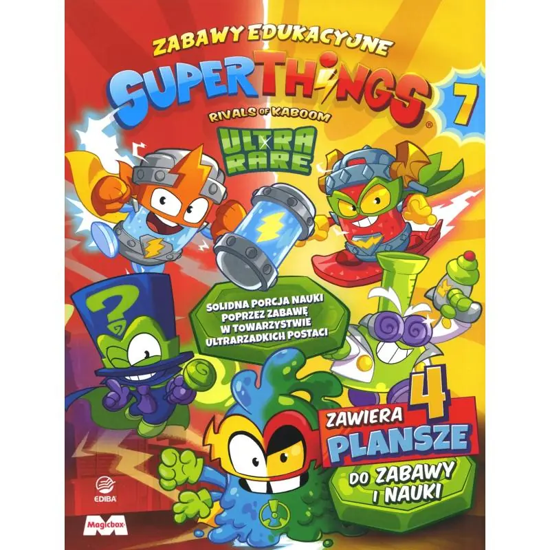Zabawy edukacyjne SuperThings 7 to kolejna książka dla fanów SuperThings, która wspiera edukację wczesnoszkolną. Na 32 stronach czytelnicy znajdą mnóstwo ciekawych wyzwań i łamigłówek, dzięki którym rozwiną swoje umiejętności z zakresu czytania ze zrozumieniem, matematyki i logicznego myślenia! Do książki dodane są 4 plansze do zabawy i nauki oraz trzy saszetki SuperThings z serii Mutant Battle