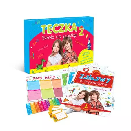 W praktycznej teczce dzieci znajdą kolorowe zeszyty edukacyjne z naklejkami, dzięki którym będą mogły ćwiczyć dodawanie i odejmowanie, doskonalić umiejętność pisania oraz uczyć się ortografii - a wszystko to w formie wesołej zabawy. Wszystkie polecenia i zadania są oparte na różnych formach aktywności: rysowaniu, naklejaniu, kolorowaniu i rozwiązywaniu łamigłówek. Ponadto do każdego zestawu dołączono naklejki na zeszyty, plan lekcji oraz zakładkę do książki z tabliczką mnożenia i podstawowymi regułami ortografii.