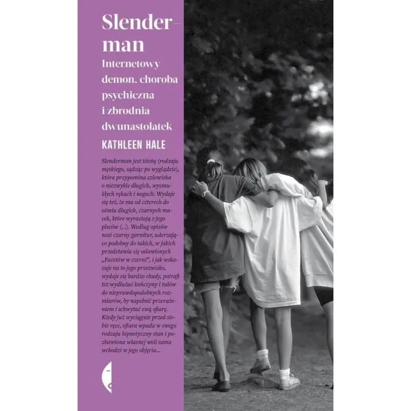 Morgan i Bella były najlepszymi przyjaciółkami, dopóki w szkole nie pojawiła się nowa dziewczynka, Anissa. To właśnie ona pokazała Morgan w internecie stronę z creepypastami – krótkimi opowiadaniami, które miały napędzić czytającemu stracha. Przeczytały tam o Slendermanie: niebezpiecznym prześladowcy i zabójcy polującym na dzieci. Obsesja Morgan i Anissy na puncie wymyślonej postaci stała się tak silna, że dziewczynki pragnęły zostać jego posłanniczkami. Aby to zrobić, postanowiły zamordować Bellę. Miały dwanaście lat, gdy wymierzyły koleżance dziewiętnaście ciosów nożem. Obie miały być sądzone jak dorosłe. Jednej groziło sześćdziesiąt pięć lat więzienia, a drugiej czterdzieści pięć. Kilka miesięcy po ich zatrzymaniu u Morgan zdiagnozowano schizofrenię, postanowiono jednak nie podawać jej żadnych lekarstw, by nie była senna na sali rozpraw. Slenderman, reportaż o słynnej tragedii, która wstrząsnęła amerykańskim społeczeństwem, opowiada nie tylko o niebezpieczeństwach wirtualnego świata i toksycznej przyjaźni. To przede wszystkim przygnębiająca opowieść o wadach amerykańskiego systemu opieki zdrowotnej i systemu sprawiedliwości. „„Slenderman” Kathleen Hale to zapadająca w pamięć, przejmująca, znakomita i potrzebna książka, której nie sposób odłożyć.” Sonia Faleiro „„Slenderman” to prawdziwy majstersztyk, lektura wciągająca i szokująca. Z jednej strony przedstawia niezwykłą rekonstrukcję mrożącej krew w żyłach zbrodni, nożowniczej napaści dwóch dwunastoletnich dziewczynek na ich przyjaciółkę i rówieśniczkę – napaści, którą ofiara cudem przeżywa. Z drugiej zaś strony to przerażająca opowieść o tym, jak stan Wisconsin potraktował sprawczynie tego przestępstwa, dziewczęta cierpiące na poważne zaburzenia psychiczne. Slenderman, owoc mrówczej pracy i drobiazgowych badań autorki, jest porywającym i fascynującym opisem dwóch powiązanych ze sobą koszmarów. Nieprędko zapomnicie tę książkę.” Andrew Scull „Ostra krytyka tego, jak społeczeństwo traktuje (i maltretuje) osoby chore umysłowo.” „Kirkus Reviews” „„Slenderman” to opis dziecięcego obłędu i jego tragicznych konsekwencji. Bazując na własnych wnikliwych badaniach i rozmowach z bohaterami tej historii, Kathleen Hale odsłania niszczycielską siłę ukrytą za tą sprawą – opisuje nie fikcyjnego Slendermana, lecz potworną niesprawność systemu sądowniczego dotykającą osoby z problemami psychicznymi. „Slenderman” to świadectwo mądrego współczucia.” Mikita Brottman „Wciągające i poruszające studium tragedii, oparte na rzetelnej pracy reporterskiej i głębokiej empatii. Opowieść ze Slendermanem w tle, która przez krótki czas elektryzowała tabloidy, dzięki nieprzeciętnemu talentowi Hale odsłania nowe, ignorowane dotąd wymiary: dorastanie na Środkowym Zachodzie, początki schizofrenii, ułomności naszego systemu sądowniczego i niepokojącą moc dziecięcej przyjaźni.” Rachel Monroe „Hale zręcznie opisuje liczne czynniki składające się na internetowe legendy, zbrodnię i jej sądowe konsekwencje […] naświetla niezwykle przygnębiającą sytuację.” „Shelf Awareness”