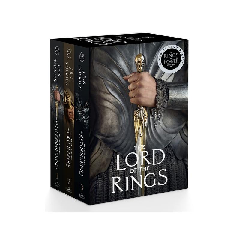 A New Legend Begins on Prime Video, in The Lord of the Rings: The Rings of Power. Sauron, the Dark Lord, has gathered to him all the Rings of Power – the means by which he intends to rule Middle-earth. All he lacks in his plans for dominion is the One Ring – the ring that rules them all – which has fallen into the hands of the hobbit, Bilbo Baggins. In a sleepy village in the Shire, young Frodo Baggins finds himself faced with an immense task, as the Ring is entrusted to his care. He must leave his home and make a perilous journey across the realms of Middle-earth to the Crack of Doom, deep inside the territories of the Dark Lord. There he must destroy the Ring forever and foil the Dark Lord in his evil purpose. This shrinkwrap-free box set is one of many new initiatives that form part of HarperCollins’ ongoing sustainability policy, aimed mainly at reducing carbon production and plastic waste. The tie-in boxes have a closed top flap and are sealed with a paper sticker, saving plastic which might otherwise have been destined for landfiil.