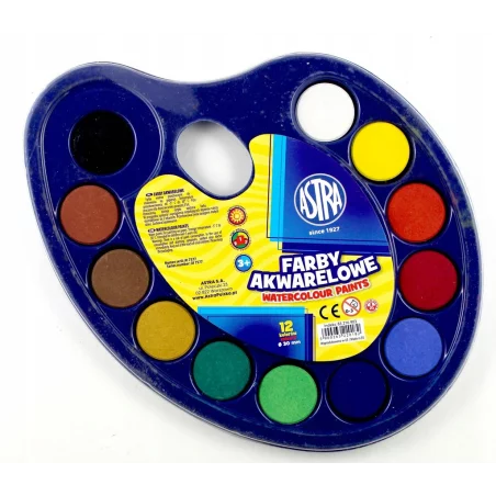 Farby akwarelowe to farby wodne służące do malowania na papierze. Mają one postać suchych guziczków, z których po zwilżeniu wodą niemal natychmiast uzyskuje się gotowe do użycia farby. Akwarele szkolne Astry składają się z wysokiej jakości drobno roztartych pigmentów, połączonych rozpuszczalnym w wodzie spoiwem.