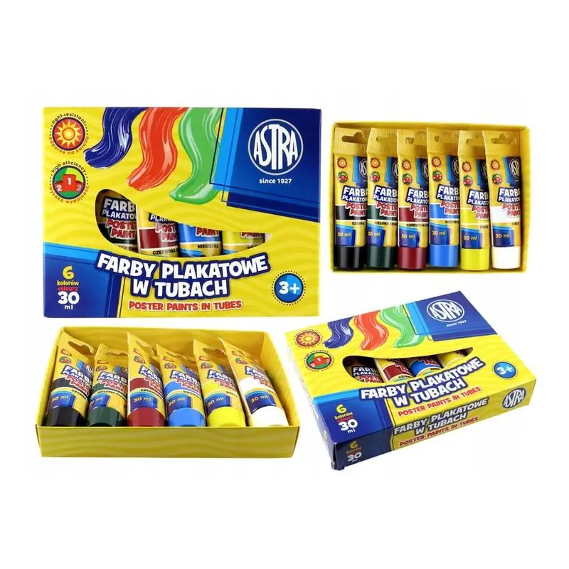 Farby plakatowe w tubach 6 kolorów Astra to wysokiej jakości zestaw farb przeznaczony do zastosowań artystycznych i edukacyjnych. Farby charakteryzują się intensywnymi, trwałymi kolorami, które łatwo się rozprowadzają na różnych powierzchniach.