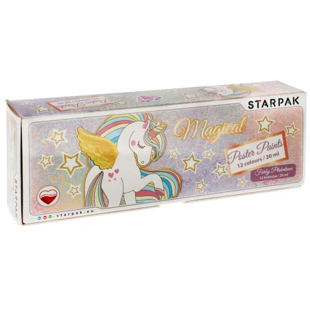 Farby plakatowe w 12 intensywnych kolorach rozwijające kreatywność małych twórców. Dzięki optymalnej konsystencji farby dokładnie pokrywają malowaną powierzchnię i mają długi okres trwałości. Piękna szata graficzna inspiruje małych malarzy. Każdy kolor farby jest zamknięty w oddzielnym 20 ml zakręcanym pojemniczku, a całość w kartonowym pudełku zdobionym inspirującą grafiką ze zwierzątkami, co ułatwia przechowywanie farb. Farby plakatowe są produkowane w Polsce.Wymiary/waga wymiary produktu dł. x wys. gł cm 3x4x3, wymiary opakowania dł. x wys. x gł. cm 23x4x8, waga produktu kg 0,04 kg, waga produktu w opakowaniu kg 0,50 kg. Nie odpowiednie dla dzieci poniżej 3 lat. Pakowane w otwierany kartonik.
