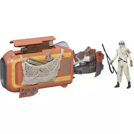 Rey, bohaterka Star Wars znajdująca się w tym zestawie, trudni się na co dzień zbieractwem, przemierzając opustoszałą planetę Jakku. Ma ona do swojej dyspozycji skuter repulsorowy, który mimo że lata świetności ma już za sobą, służy jej całkiem przyzwoicie. Figurka Rey należy do specjalnej edycji kolekcjonerskiej, nie znajdziemy podobnej