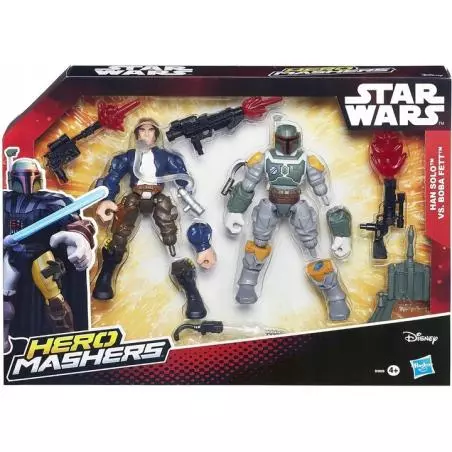 Z odległej galaktyki przybywają zabawki z serii Star Wars: Hero Mashers! Ten 2-pak zawiera figurkę Hana Solo i Boby Fetta. Każda figurka jest wyposażona w uniwersalne punkty połączeniowe, dzięki czemu możesz odłączyć głowę, ramiona i nogi a następnie podłączyć je gdzie tylko chcesz. Uniwersalne złącza pozwalają na wymianę części z dowolną figurką serii Star Wars: Hero Mashers, dzięki czemu możesz w wyjątkowy sposób spersonalizować swojego bohatera (każda figurka sprzedawana oddzielnie). Zmodernizuj swoją figurkę do poziomu umożliwiającego przeżycie epickiej intergalaktycznej przygody! Produkty ze świata Gwiezdnych wojen są wytwarzane przez firmę Hasbro na licencji pozyskanej od firmy Lucasfilm Ltd. Hero Mashers oraz wszystkie powiązane terminy to znaki towarowe firmy Hasbro.