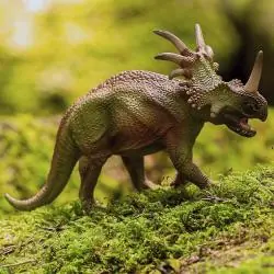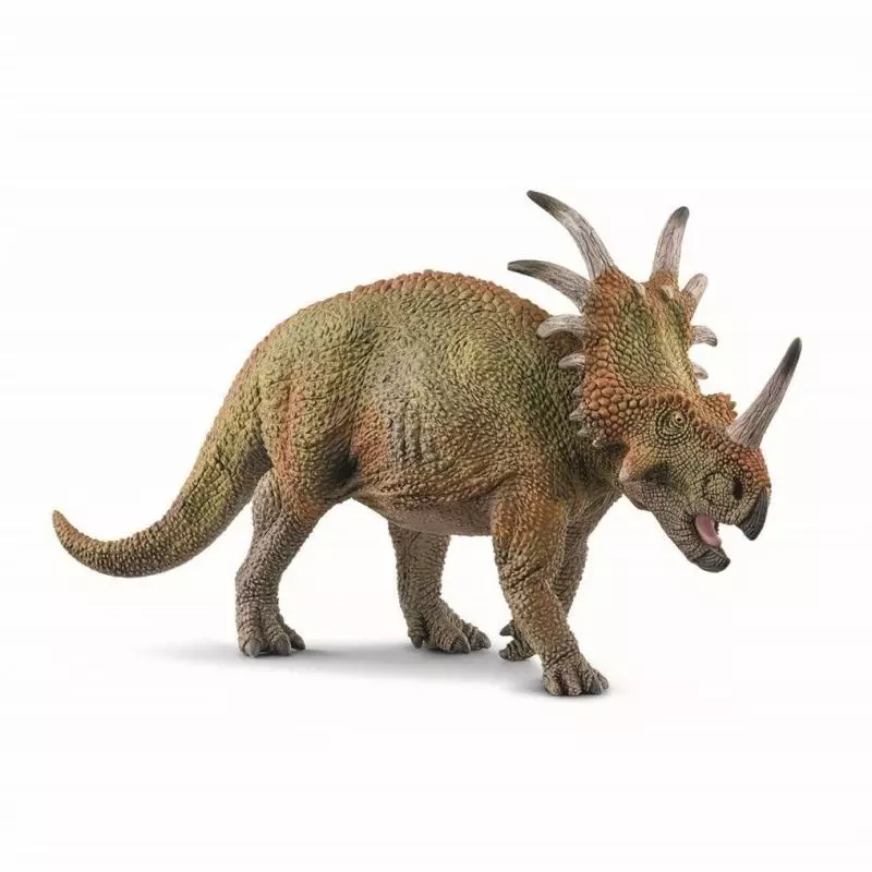 Nasz styrakozaur z serii Schleich® Dinosaurs uwielbia zarzucać obręcze na swój wielki róg. Jego usta w kształcie dzioba służą nie tylko do świetnego zarzucania ich do góry, lecz także do zjadania twardych, włóknistych roślin. Swej ogromnej kryzy używa do ochrony lub jako podłoża, na którym jego koledzy dinozaury mogą malować, ale tylko