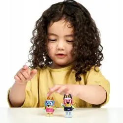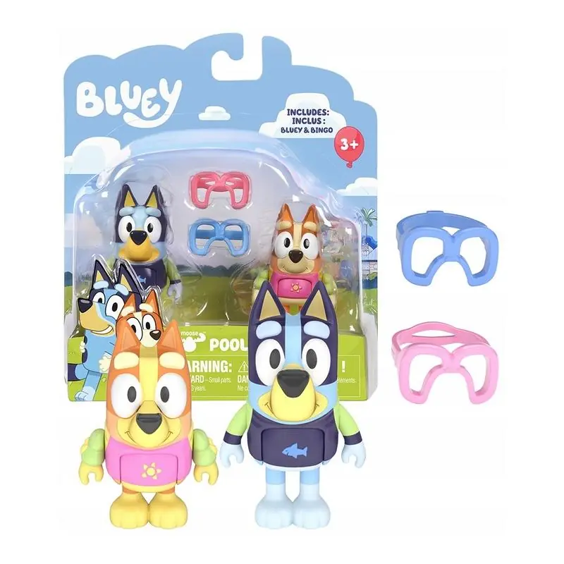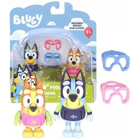 Zabawa na basenie jest zestawem dwóch ruchomych figurek piesków. Ubrana w strój kąpielowy Bluey jest gotowa na wodną zabawę. Nałóż pieskom gogle pływackie i hop do wody!